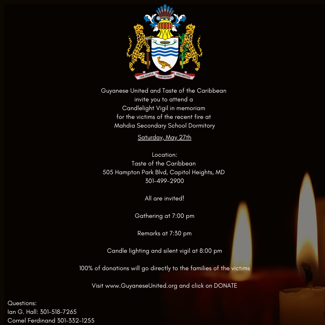 Guyanese United and The Taste of the Caribbean are sponsoring a candlelight vigil in memoriam of the victims of the School Dormitory fire in Mahdia, Guyana.