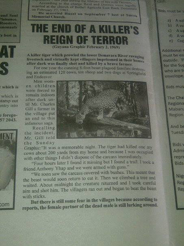 A killer tiger that prowled the lower Demerara River ravaging livestock and virtually keeping villagers imprisoned in their homes after dark was finally shot and killed by a brave farmer.